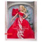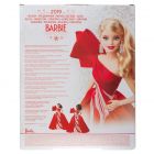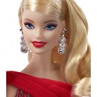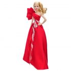 Кукла Барби сияет в элегантном платье с красно-белым праздничным принтом и искрящимися серебристыми вставками. Красивый бант украшает плечо, а красный шлейф дополняет вечерний образ.